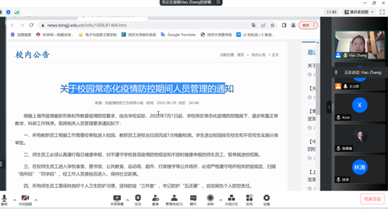 张皓副院长首先带领外籍教师深入学习了关于校园常态化疫情防控期间人员管理的通知,重点强调了教职工进校工作审批流程的变化,核酸检测及健康申报等事宜。随后,她介绍了学校的暑期工作安排,逐一了解外籍教师暑期工作的安排及计划,以及现阶段遇到的困难和问题,并进行了记录和反馈。