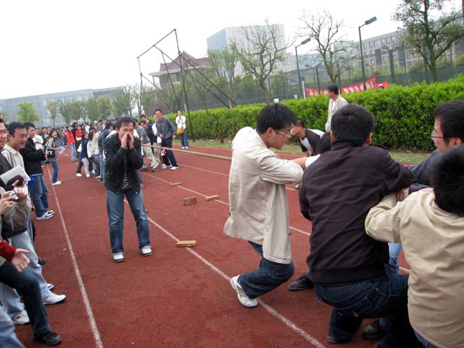 4月14日中午,学院研究生电信之春系列活动之“携手共进,e路辉煌”拔河比赛在嘉定校区田径场举行,包括各专业导师在内的百余名师生参与了此次比赛。