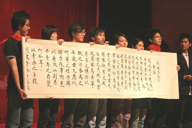 周书记在各学院学生代表共同展开的一幅书法长卷上拓印并给晚会致辞。随后,歌会正式开始。歌会分三个篇章,分别是流金岁月、青春之歌、放飞理想。