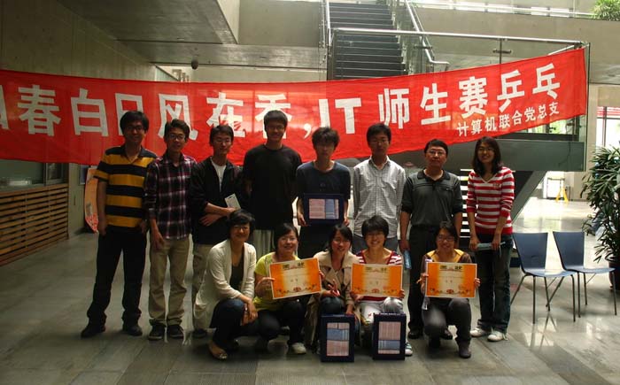 本次比赛是在前期预赛的基础上进行的。按照竞赛规程,计算机系的各实验室分别派出两男一女组队参加比赛。比赛已于4月27日进行了小组循环赛,5月4日进行了半决赛。参赛的队伍有移动创新实验室,脑电实验室,数据挖掘实验室,信息安全实验室,可信实验室,模式识别实验室,ADMIS实验室和苹果研究室等8个实验室。经过激烈的对抗,最终脑电实验室获团体冠军,移动创新实验室获亚军,ADMIS获季军。(高学智)