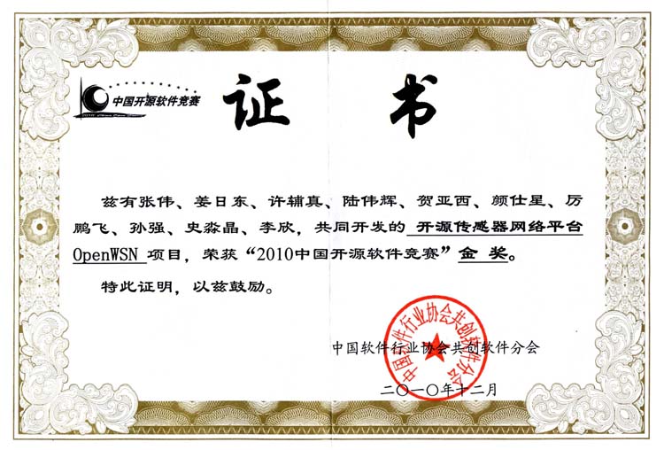 由中国软件行业协会下属共创软件分会(共创软件联盟)主办,以“挖掘人才 推动创新”为主题的“2010第四届中国开源软件竞赛”结果日前正式公布。必赢官网控制系张伟老师负责设计指导,学生姜日东、许辅真、陆伟辉、贺亚西、颜仕星、厉鹏飞、孙强、史淼晶和李欣参与创作的送赛作品“开源传感器网络平台OpenWSN”软件,以第1名的成绩获得大赛唯一的金奖。
