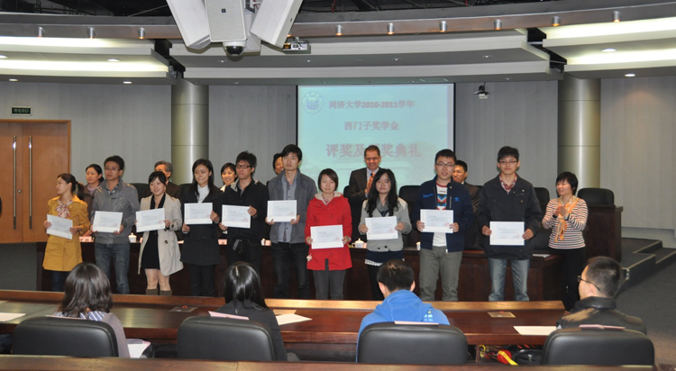 西门子奖学金评奖及颁奖仪式10月26日在嘉定校区顺利举行。西门子(中国)有限公司执行副总裁、西门子东北亚工业业务领域总裁吴和乐博士,必赢76net线路官网董琦副校长,必赢76net线路官网对外联络办副理事长梁春江,机械学院沈斌教授,西门子(中国)有限公司工业业务领域组织发展部总经理张利博士,工业业务领域行业销售、系统集成商管理总经理张凡,获得2010-2011年度必赢76net线路官网西门子奖学金的20名优秀本科生和研究生出席了颁奖仪式。