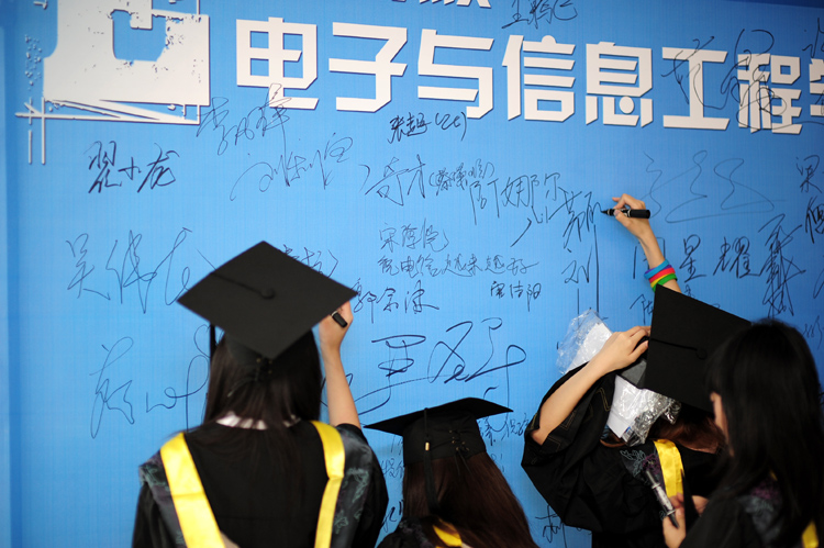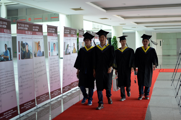会场入口处,老师和毕业生纷纷以走红地毯的形式入场,并在许愿墙上留字、合影。地毯一侧的展板上,摆设的是同学们评选出的“最可爱的专业教师”给毕业生的寄语。地毯另一侧的展板上,摆设的是毕业生们大学四年生活点滴的照片。