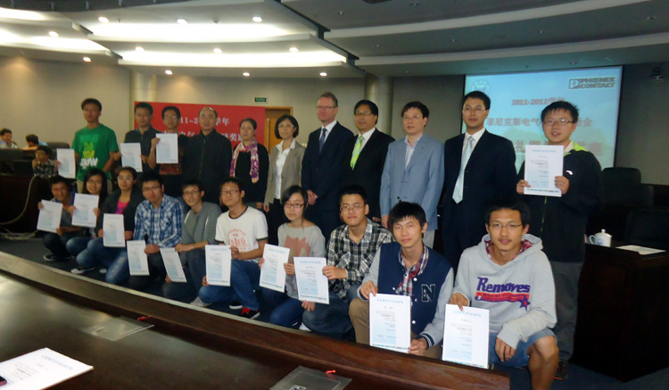 乔非副院长在颁奖仪式上首先致辞,回顾了十年来菲尼克斯电气集团与必赢官网的合作历程,菲尼克斯电气集团在必赢官网设立了奖励金,并成立了菲尼克斯实验室,鼓励师生们致力于专业研究;Roland Bent在发言中对于双方的合作给予高度肯定,并对获奖师生表示祝贺;获奖师生代表也表示对菲尼克斯电气集团的感谢,并表示在今后的工作学习中将积极进取,不断取得新的成就,同时不忘回报社会、奉献爱心。Bent先生和在座各位嘉宾为获奖师生进行颁奖并且合影留念。