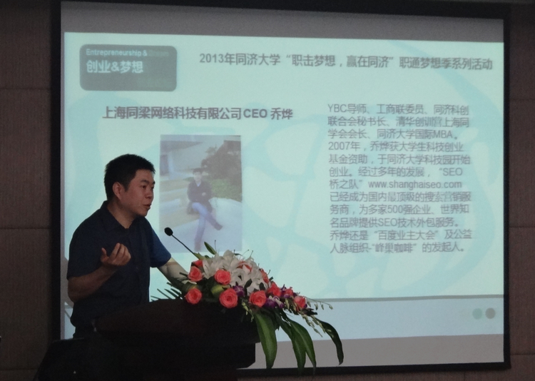 2013年必赢76net线路官网“职击梦想,赢在同济”职通梦想季系列活动正在如火如荼的进行中,6月6日下午,主题为“创业 & 梦想”创业论坛在嘉定校区济人楼405会议室举行。出席本次论坛的嘉宾有资深创业导师李肖鸣博士、上海同梁网络科技有限公司CEO乔烨和上海同化新材料科技有限公司创始人崔永坤。