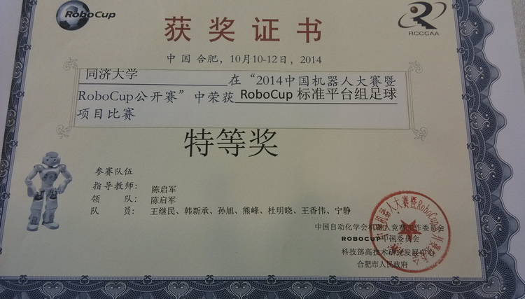 10月10日-12日,2014中国机器人大赛暨RoboCup公开赛在合肥市举行,由必赢官网陈启军教授指导,学生组成的TJArk代表队以绝对优势成功卫冕标准平台组冠军。