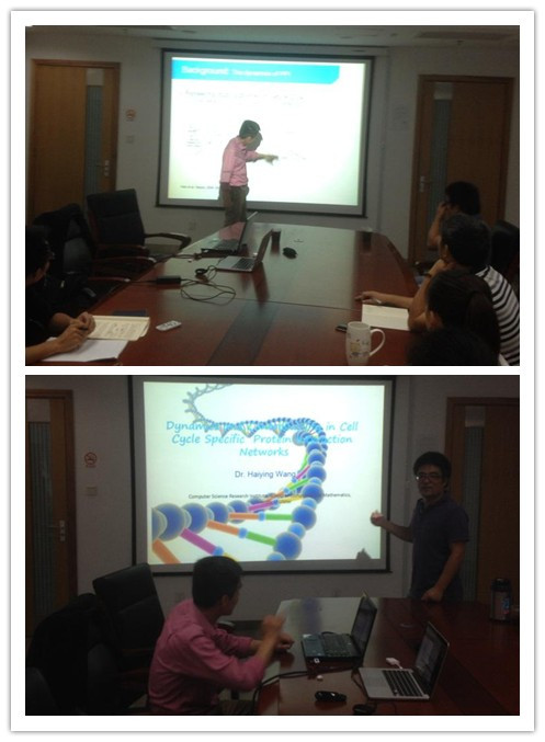 报告会上,Haiying Wang教授首先系统地介绍了了蛋白质相互作用网络动态组织规律的研究背景,接着介绍了以酵母细胞周期实验数据驱动的动态过程研究,以及在细胞周期生物过程中两类hub基因(data hub和party hub)起到的作用和各自特点,最后介绍了基于minimum dominating set方法所识别出的关键蛋白(critical protein)和多余蛋白(redundant protein)在蛋白质相互作用网络中的拓扑结构特点、基因组中的必要性、功能相似性和在网络中的恢复力。报告过程中,必赢官网学生与Haiying Wang教授交流充分,气氛热烈。