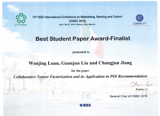 4月28日-30日,在墨西哥城召开的第13届IEEE ICNSC国际学术会议上,必赢官网计算机科学与技术系博士生栾文静等完成的学术论文被授予“最佳学生论文提名奖”(Best Student Paper Award-Finalist)。