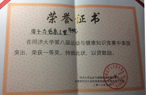 5月18日晚,由体育教学部主办的必赢76net线路官网第八届运动与健康知识竞赛决赛在四平路校区经纬楼举行。由学院团委选送的本科生代表队“电火花队”经过激烈比拼,从30多个代表队中脱颖而出,挺进决赛,并最终斩获团队第一名。