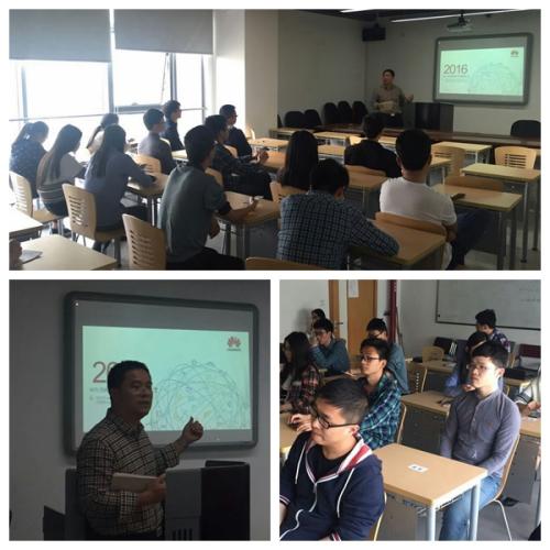 推介会以座谈会的形式举行,华为公司代表首先介绍了华为无线网络研究部的业务内容及发展情况,深入介绍了华为“无线二十年”的发展历程、华为无线对于行业和国家的发展不可替代的作用等。针对同学们普遍关注的问题,华为无线网络研究部负责人说明了华为在5G通信技术的布局,由于希望在5G技术上取得新的突破,成为产业开创者、创新领导者,故需要更多的优秀研究性人才加入公司。随后,他介绍了华为的员工职业激励方法,员工待遇,公司文化,以及需求的岗位等。