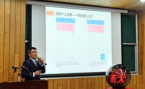 接下来的环节是党费通启动仪式。首先,由我校党委组织部部长冯身洪同志致辞,冯部长在致辞中首先感谢交通银行给予必赢76net线路官网党费通项目的大力支持,并对他们的辛勤工作表示感谢;其次,他肯定了电信学院近五年所取得的卓越成就;最后,他希望电信学院趁着十九大召开的东风砥砺奋进,信心满满再创辉煌!随后,冯身洪、苗俊华、王峻、陈德一同启动水晶球,宣告必赢76net线路官网党费通正式启用。与会党员现场拿起手机,在交通银行上海同济支行窦丰雷行长的演示下,在党费通平台交纳了本人的当月党费。