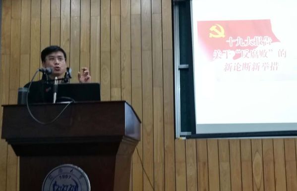 吴利瑞同志首先用八个“关于”为大家解读了十九大报告的精髓,分别是“关于党的十九大的主题和主要成果、关于习近平新时代中国特色社会主义思想、关于过去五年的历史性成就和历史性变革、关于中国特色社会主义进入新时代、关于我国社会主要矛盾的变化、关于两个一百年奋斗目标的战略部署、关于我国经济社会发展重大战略部署、关于坚定不移推进全面从严治党”。报告从“八个明确”的思想内涵、“十四个坚持”的基本方略、“四个新境界”的历史地位三个方面着重阐释了习近平新时代中国特色社会主义思想;从基本依据、主要内涵、重大意义和历史使命的角度分析了“中国特色社会主义进入新时代”;从“清醒认识党的建设面临的形势、把握新时代党的建设总要求、把握新形势下全面从严治党的重点任务、党员干部应当注重增强八大本领”等四个方面深刻分析了坚定不移推进全面从严治党的内容。