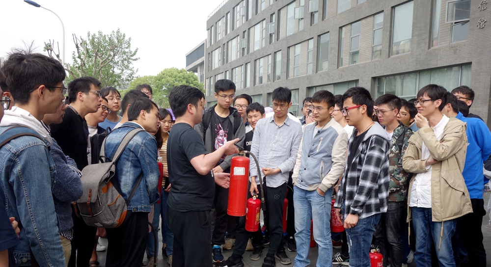 讲座结束后,学院保安人员与韩飞老师合作演示,为师生们清楚地讲解了灭火器的使用、如何在保证自身安全的情况下扑灭火灾,同学们纷纷效仿练习,救火演习顺利展开。
