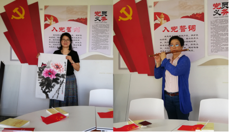 在“我为祖国祝福”环节,支部成员根据各自特长,纷纷表达对祖国母亲的诚挚祝福。预备党员宋娇同志用绘画作品表达对祖国的祝福,雍容华贵、花团锦簇的牡丹象征着祖国的繁荣昌盛、国泰民安,栩栩如生的山水画表达了对祖国锦绣山河的赞美。党员方春华同志用长笛演奏了歌曲《我和我的祖国》,笛声清脆优美,真情表达了对祖国的真挚祝福。